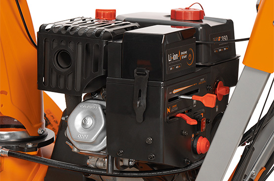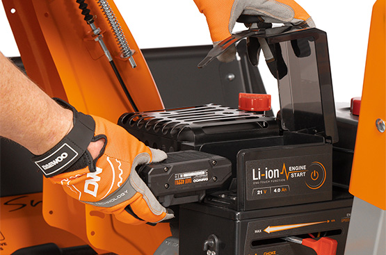 Благодаря установленному Li-ion аккумулятору на 21В, двигатель запускается простым нажатием кнопки на рукоятке управления. Обеспечивает легкий запуск холодного двигателя при любых температурах до -30˚C.