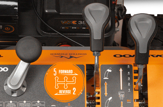 Система обеспечивает выбор скоростей: 5 скоростей вперед и 2 скорости назад, в зависимости от высоты снежного покрова. Простая и одновременно надежная система перемещения фрикционного диска для изменения скорости.