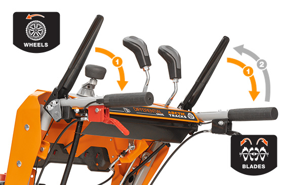 3 положения работы гусениц: 1Х MODE максимальная проходимость в глубоком снегу и в горах. 2Х MODE маневренность и скорость работы колесного снегоуборщика. 3Х MODE режим работы грейдера для очистки поверхности до основания.