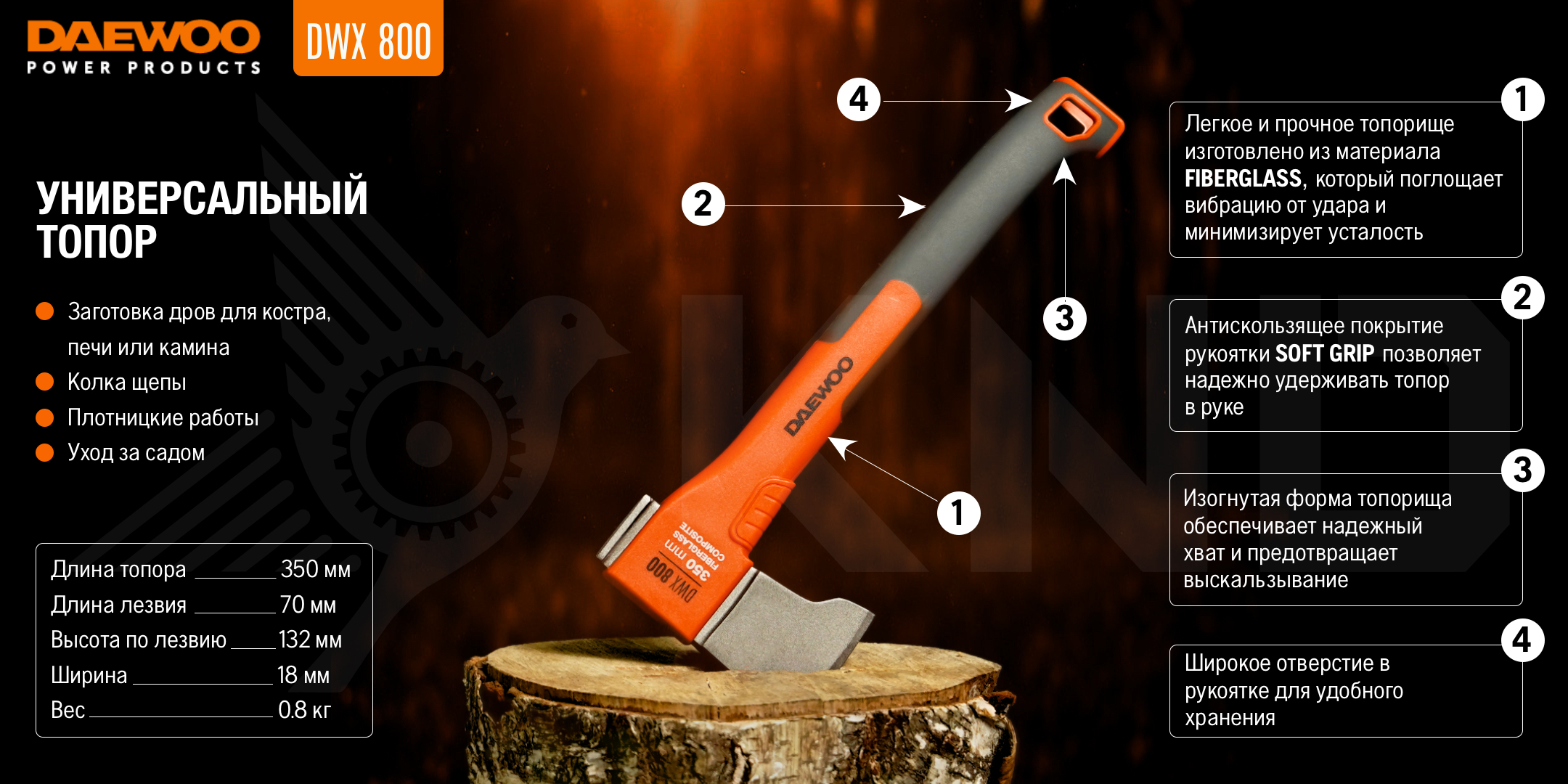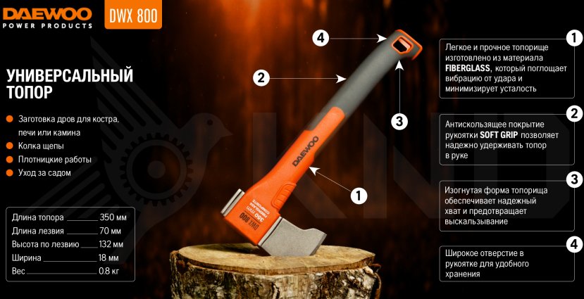 Только у нас топор универсальный 350 мм DAEWOO DWX 800 по самой доступной цене! На все товары распространяется гарантия от производителя. Оперативная доставка в Белгороде. Оформите заказ сейчас и специалисты интернет-магазина свяжутся с Вами в течение нескольких минут.